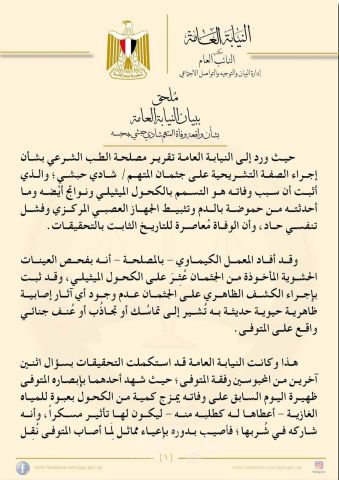 هذا وكانت النيابة العامة قد استكملت التحقيقات بسؤال اثنين آخرين من المحبوسين رفقة المتوفى؛ حيث شهد أحدهما بإبصاره المتوفى ظهيرة اليوم السابق على وفاته يمزج كمية من الكحول بعبوة للمياه الغازية - أعطاها له كطلبه منه - ليكون لها تأثير مسكراً، وأنه شاركه في شُربها؛ فأصيب بدوره بإعياء مماثل لِمَا أصاب المتوفى نُقِل على إثره لتلقي العلاج، مُؤكداً على سلامة الصحة النفسية والبدنية للمتوفى قبل تلك الواقعة.وشهد الثاني بعلمه من المتوفى والشاهد السابق بمزج عبوة المياه الغازية التي كانت بحوزتهما بالكحول ليكون لها تأثيراً مسكراً، وإبصاره كذلك معهما عبوة كحول فارغة وأخرى ممتلئة.