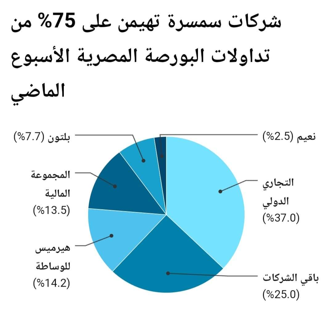 هيمنت 5 شركات تداول أوراق مالية على 75% من تداولات البورصة المصرية، الأسبوع الماضي، تصدّرها التجاري الدولي للسمسرة بـ 37% بقيمة تعاملات 8.8 مليار جنيه.