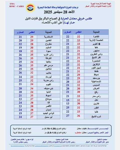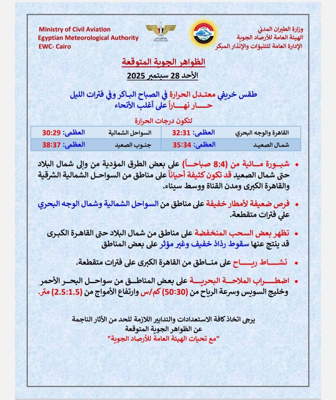 وتوقعت الهيئة أن يسود غدًا الأحد 28 سبتمبر 2025، طقس خريفي معتدل الحرارة في الصباح الباكر وفي فترات الليل حار نهارًا على أغلب الأنحاء، لتكون درجات الحرارة العظمى على النحو التالي: القاهرة والوجه البحري: 31-32.