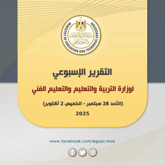 أصدر المركز الإعلامي لوزارة التربية والتعليم والتعليم الفني التقرير الأسبوعي للوزارة خلال الفترة من (الأحد ٢٨ سبتمبر - الخميس ٢ أكتوبر ٢٠٢٥) ويتضمن ما يلى: