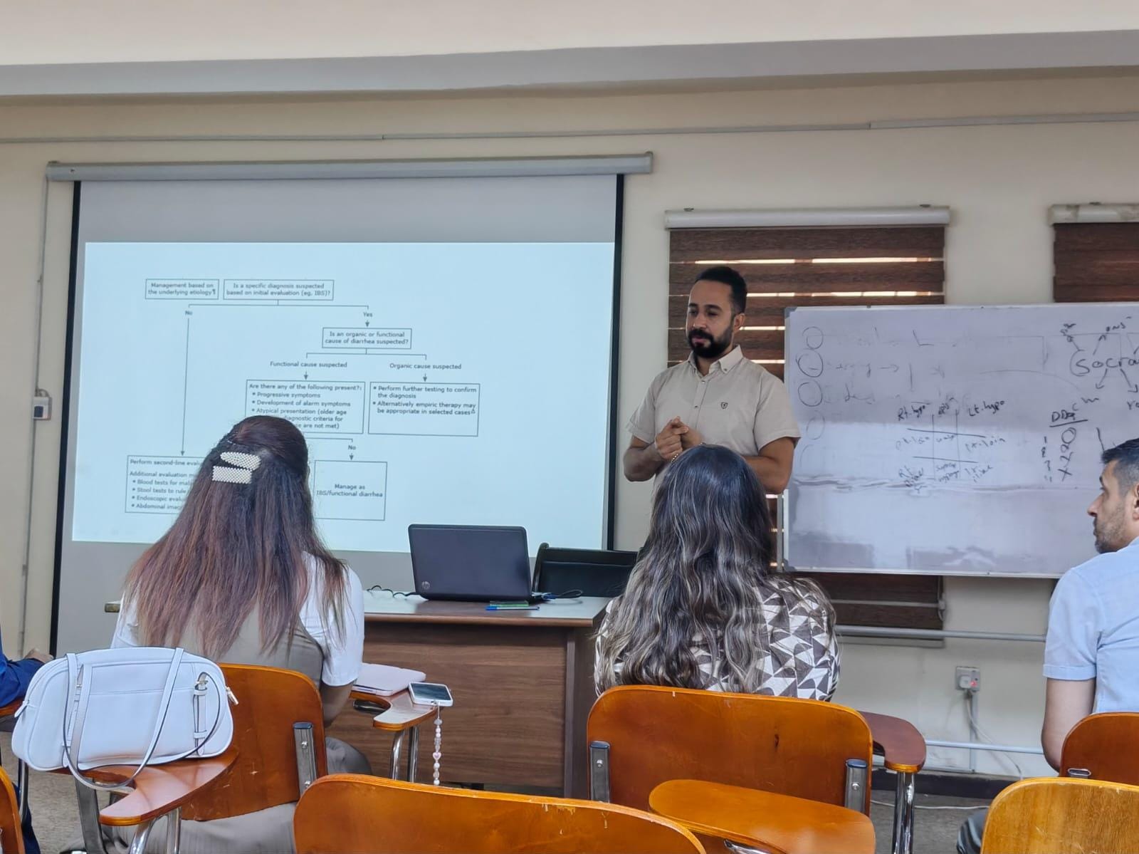 محاضرة علمية في كلية طب المستنصرية ببغداد عن فهم طريقة التعامل مع حالات الإسهال المزمن وكيفية تشخيصها وعلاجها
