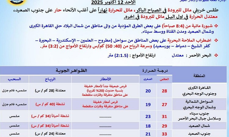 وأضاف الخبراء أنه بالنسبة لحالة البحر المتوسط فتكون معتدلة إلى مضطربة، وارتفاع الموج من مترين إلى 3 أمتار، واتجاة الرياح شمالية غربية، أما حالة البحر الأحمر فتكون معتدلة، وارتفاع الموج من 1,5 متر إلى مترين، واتجاه الرياح: شمالية غربية.
