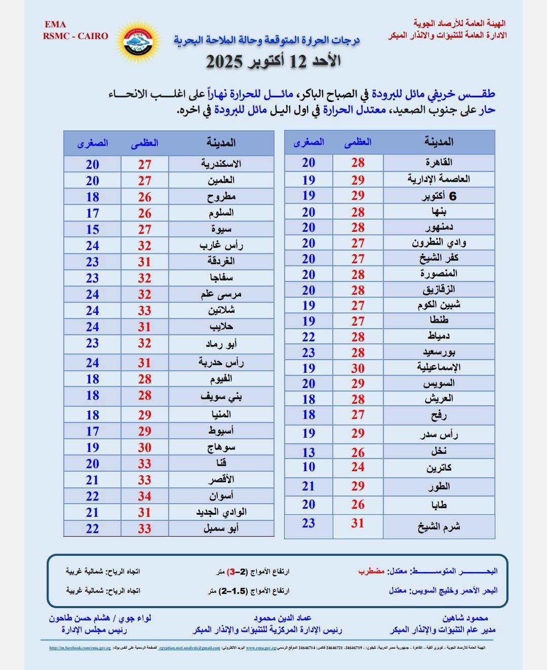 وتسجل درجات الحرارة المتوقعة غدا العظمى بالقاهرة 28 والصغرى 20 والاسكندرية العظمى 27 والصغرى 20 وأسوان العظمى 34 والصغرى 22 .