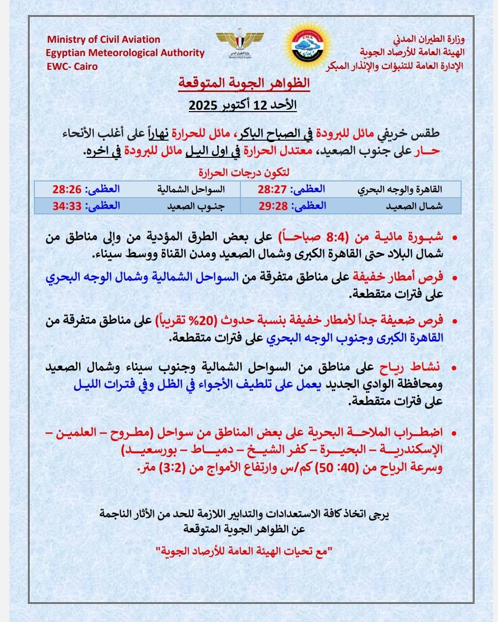 وأوضح الخبراء أنه بالنسبة للظواهر الجوية، فمن المتوقع أن تكون هناك شبورة مائية صباحا على شمال البلاد حتى القاهرة الكبرى وشمال الصعيد على بعض الطرق الزراعية والسريعة والقربية من المسطحات المائية، مع فرص لأمطار خفيفة على مناطق متفرقة من السواحل الشمالية وشمال الوجه البحرى على فترات متقطعة.