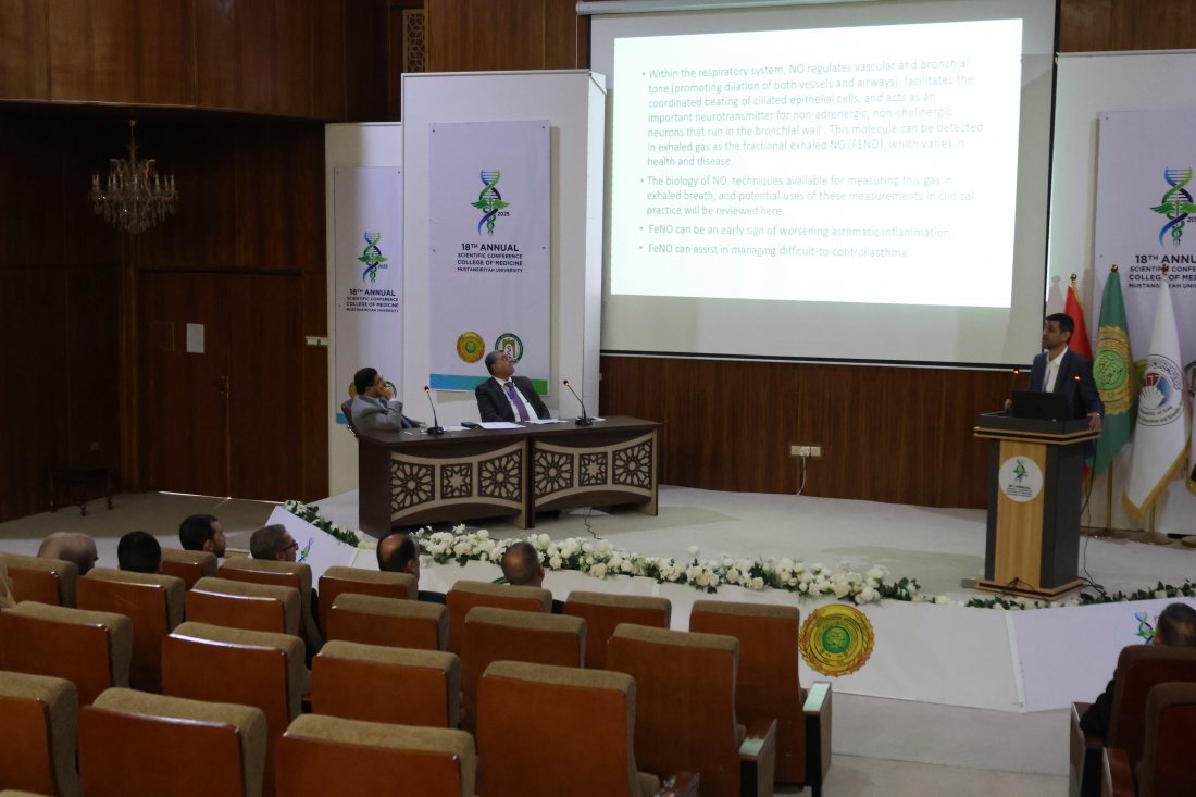 ضمن فعاليات اليوم الأول لانعقاد المؤتمر العلمي السنوي الثامن عشر لكلية الطب / الجامعة المستنصرية ببغداد والذي انعقد برعاية رئيس الجامعة المستنصرية الأستاذ الدكتور صفاء تقي العيساوي واشراف عميد الكلية ورئيس المؤتمر الأستاذ المساعد الدكتور غسان علي القزويني ، تم تنظيم جلستين علميتين كانت الأولى برئاسة أ.د. عباس الشريفي وأ.د. عبد الحميد القصير ( مقرراً للجلسة ) حيث تضمنت سبعة محاور عن ( ما الجديد في إدارة مرض الانسداد الرئوي المزمن؟ - تحديث في ارتفاع ضغط الدم الرئوي - روكسيتور بلس: خطوة من الخطر إلى الحيوية - التشخيص التفريقي لتسرع القلب الضيق المعقد: على تخطيط القلب الكهربائي - دور أكسيد النيتريك في تقييم مرضى الربو في الممارسة العملية - مستجدات في طب الجهاز الهضمي والكبد -حالات نادرة في أمراض الروماتيزم ).