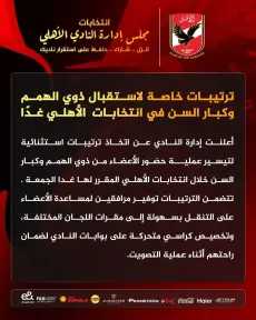 ووجه محمود الخطيب، رئيس مجلس إدارة النادي الأهلي، الشكر إلى اللجنة القضائية المشرفة على انتخابات النادي، برئاسة المستشار زكي شلقامي، مدير التفتيش القضائي، نائب رئيس هيئة النيابة الإدارية، وعضوية كل من المستشار إبراهيم فكار نائب رئيس هيئة النيابة الإدارية، والمستشار محمد حافظ نائب رئيس هيئة النيابة الإدارية، والمستشار محمد عبد المعطي نائب رئيس هيئة النيابة الإدارية، وذلك على جهودهم الكبيرة.