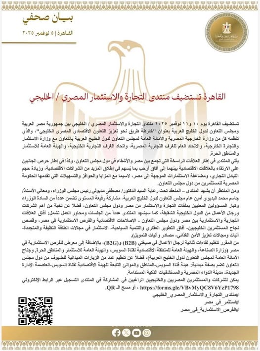 ومن المنتظر أن يشهد المنتدى، الذي يعقد تحت رعاية الدكتور مصطفى مدبولي رئيس مجلس الوزراء، وجاسم محمد البديوي أمين عام مجلس التعاون لدول الخليج العربية، مشاركة رفيعة المستوى تضم عددًا من الوزراء وكبار المسؤولين المعنيين بملفات التجارة والاستثمار من مصر ودول مجلس التعاون، فضلاً عن نخبة من أهم الشركات ورجال الأعمال من الدول الخليجية الشقيقة.