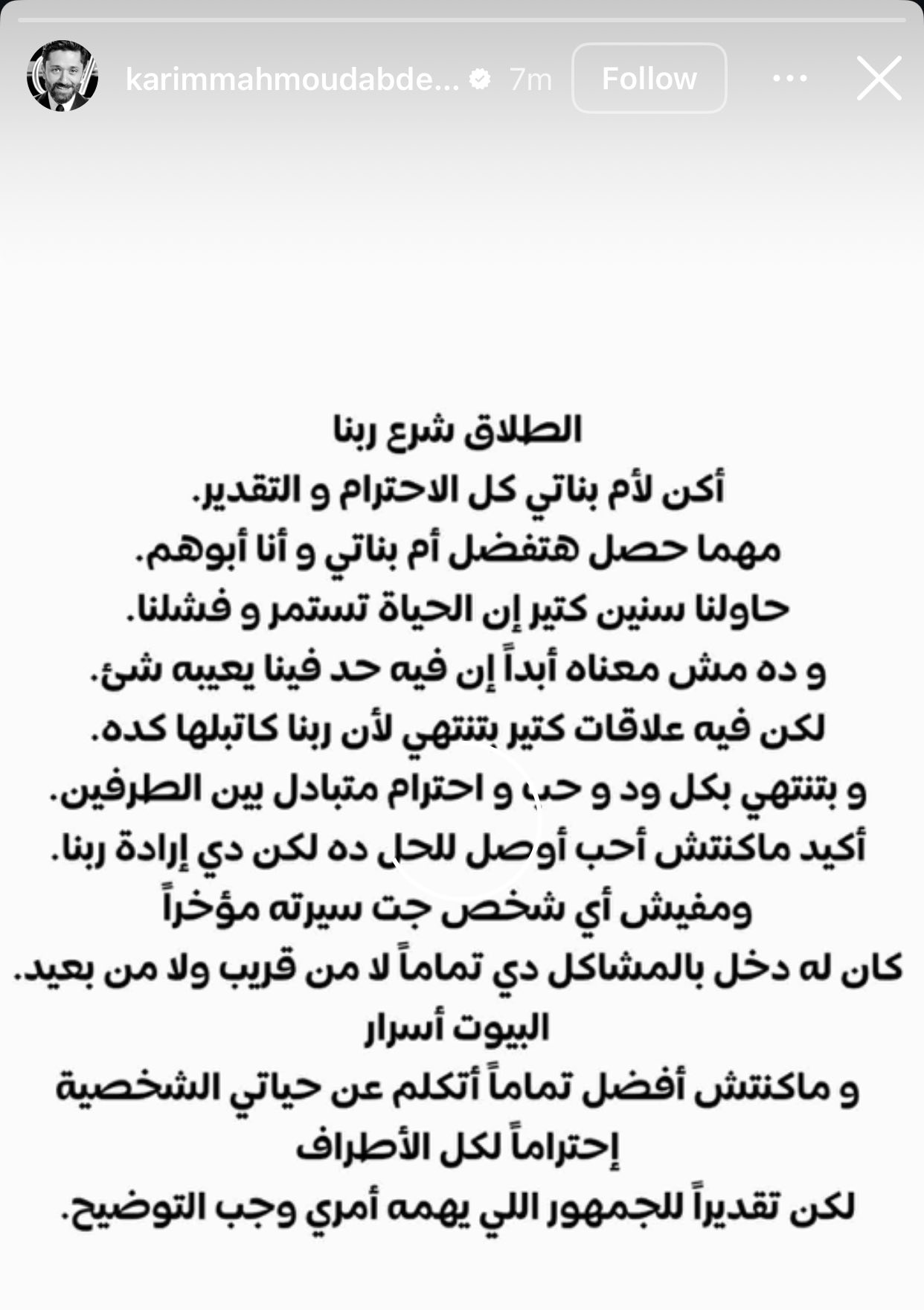 وكتب كريم محمود عبدالعزيز عبر حسابه الرسمي على موقع التواصل الاجتماعي انستجرام: الطلاق شرع ربنا .. أكن لأم بناتي كل الاحترام والتقدير..