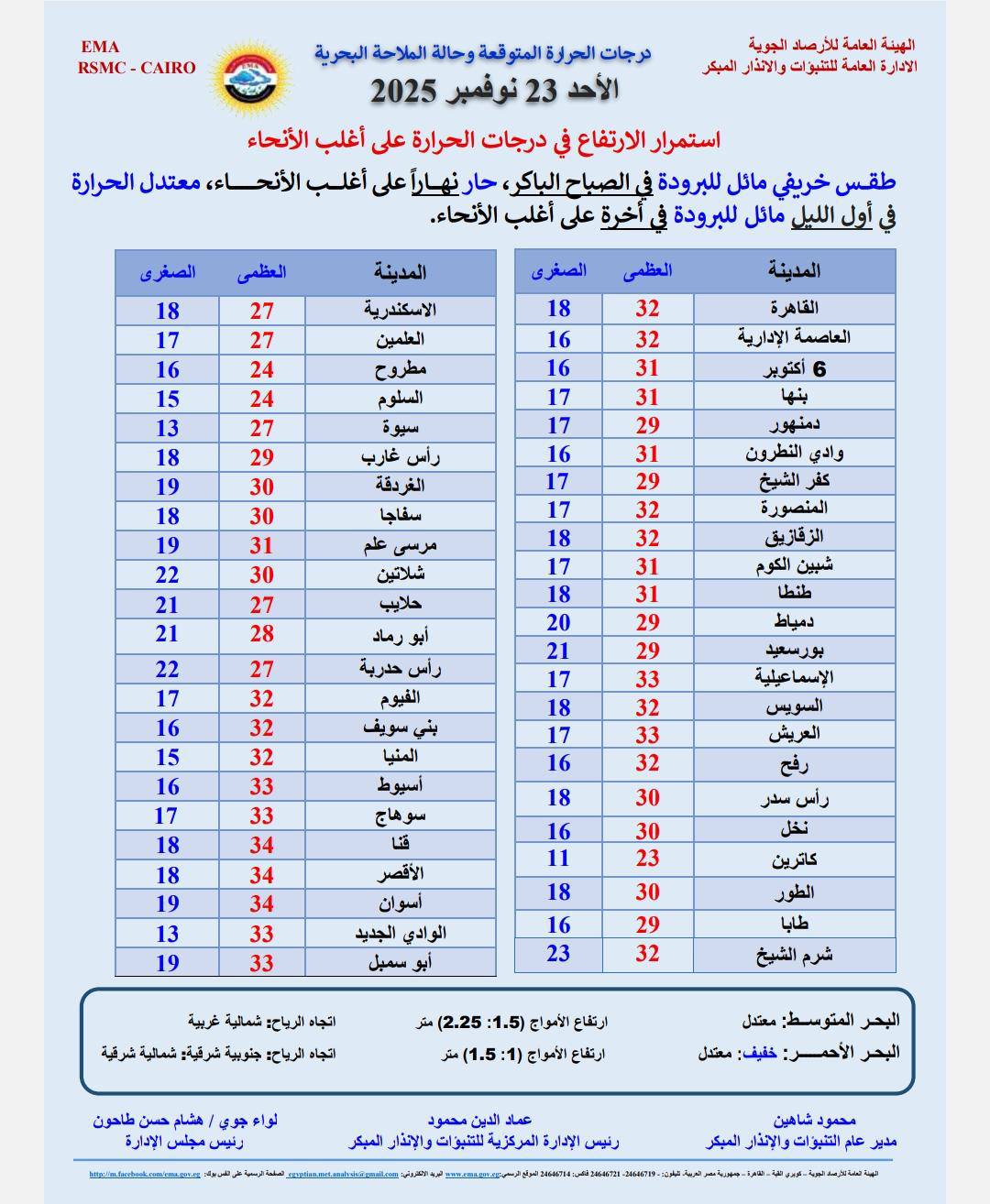 تتوقع الهيئة العامة للأرصاد الجوية أن يشهد غدا الأحد 23 نوفمبر استمرار الارتفاع التدريجي في درجات الحرارة على أغلب الأنحاء، ليسود طقس خريفي مائل للبرودة في الصباح الباكر، حار نهارًا على معظم المناطق، بينما يميل للبرودة خلال ساعات الليل المتأخرة.
