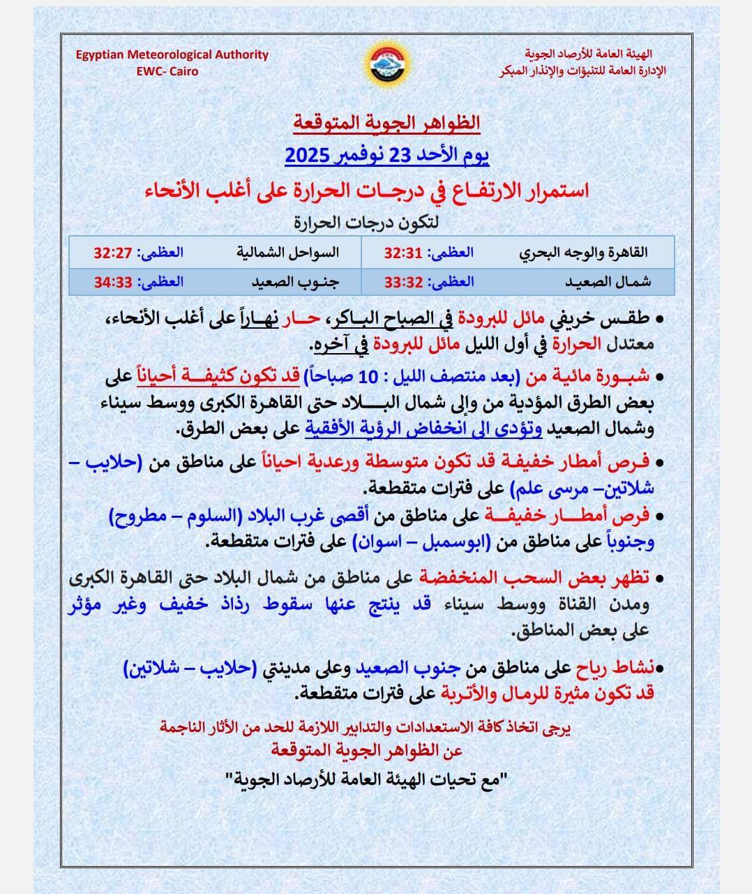 النشرة الجوية والظواهر الجوية المتوقعة ليوم غد الأحد الموافق 23 نوفمبر 2025