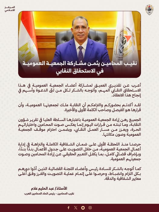 أصدر نقيب المحامين، الأستاذ عبد الحليم علام، بيانًا يعبر فيه عن تقديره العميق لمشاركة أعضاء الجمعية العمومية في الاستحقاق النقابي الأخير، وشكر كل من لبّى الدعوة وأسهم في إنجاح هذا الانعقاد، مؤكدًا على الدور المحوري للجمعية العمومية في رسم مسار النقابة وصون إرادتها.