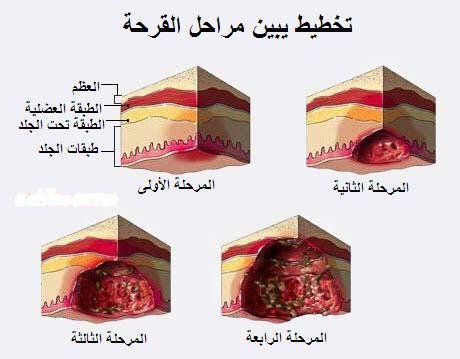 - الدرجة الاولى إحمرار جلدي ثابت لا يتغير عند الضغط عليه ، الدرجة الثانية تآكل سطحي لبشرة الجلد ، الدرجة الثالثة تقرح ( تآكل لأدمة الجلد ) وصولاً للطبقة الدهنية مع حدوث التهاب وتقيح ، الدرجة الرابعة تقرح عميق يصل الى العضلات او العظم مع حدوث التهاب وتقيح.