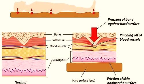 - آلية حدوث القرحة تعتمد على إن الضغط المستمر على المناطق المذكورة أعلاه ، يؤدي الى نضوب وصول الدم الى الأنسجة الرخوة والجلد ، مما يشكل خطراً على حيوية هذه الأنسجة وبالتالي موت الخلايا وحدوث القرحة.