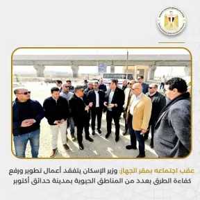 عقد المهندس شريف الشربيني، وزير الإسكان والمرافق والمجتمعات العمرانية، اجتماعا بمقر جهاز مدينة حدائق أكتوبر، لمتابعة سير العمل بمختلف القطاعات بالمدينة، والمشروعات التنموية المختلفة الجارى تنفيذها، ودفع العمل وتذليل أي عقبات، وذلك بحضور مسئولي وزارة الإسكان، وهيئة المجتمعات العمرانية الجديدة، ورئيس جهاز المدينة.وفي مستهل الاجتماع، تابع وزير الإسكان أعمال التطوير للمحاور ومداخل مدينة حدائق أكتوبر، حيث يبلغ إجمالي أطوال الطرق الرئيسية بالمدينة حوالي 93كم، وإجمالي أطوال الطرق المنفذة حوالى 654كم، وأطوال الطرق الجارى تنفيذها حوالى 202 كم، من بينها ٩ طرق رئيسية تم وجار تطويرها، فضلا عن الطرق الجاري والمخطط تنفيذها.