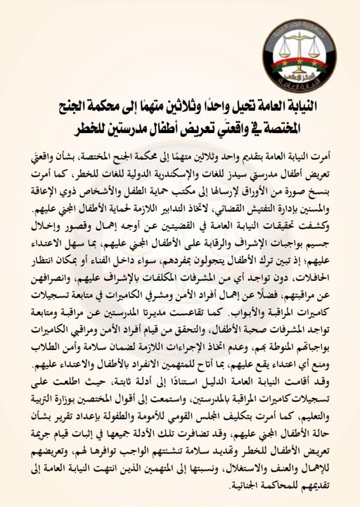 النيابة العامة تحيل واحدًا وثلاثين متهمًا إلى محكمة الجنح المختصة في واقعتَي تعريض أطفال مدرستين للخطر