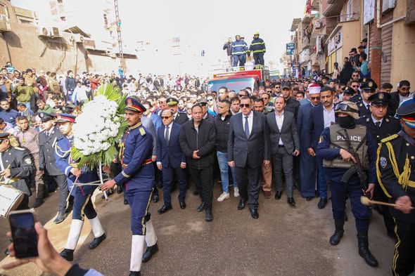 حيث تقدم محافظ كفرالشيخ صفوف المشيعين خلال الجنازة إلى مثواه الأخير بمسقط رأسه بمدينة بيلا، حيث أُقيم موكب جنائزي مهيب لتشييع جثمان الشهيد، وأُديت صلاة الجنازة بمسجد المرسي، في مشهد يعكس تقدير الدولة والمجتمع لتضحيات رجال الشرطة، وسط حضور شعبي كبير.