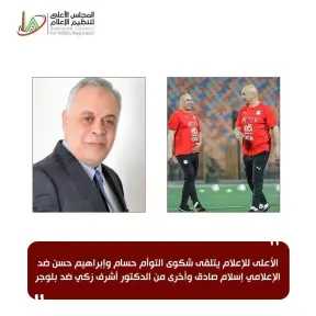 قررت لجنة الشكاوى بالمجلس الأعلى لتنظيم الإعلام، برئاسة الإعلامي عصام الأمير، وكيل المجلس، استدعاء المسئول عن إدارة الصفحة باسم/ إسلام صادق على موقع التواصل الاجتماعي فيس بوك، بناءً على الشكوى المقدمة من وكيل الكابتن/ حسام حسن، المدير الفني للمنتخب الوطني، والكابتن/ إبراهيم حسن، مدير الكرة بالمنتخب، بشأن ما تضمنته بعض المواد المنشورة عبر الصفحة من مخالفات للضوابط والمعايير والأكواد الصادرة عن المجلس، وتمس الجهاز الفني للمنتخب الوطني المصري، وتكرار ذلك في تصريحات لأحد البرامج الإذاعية.