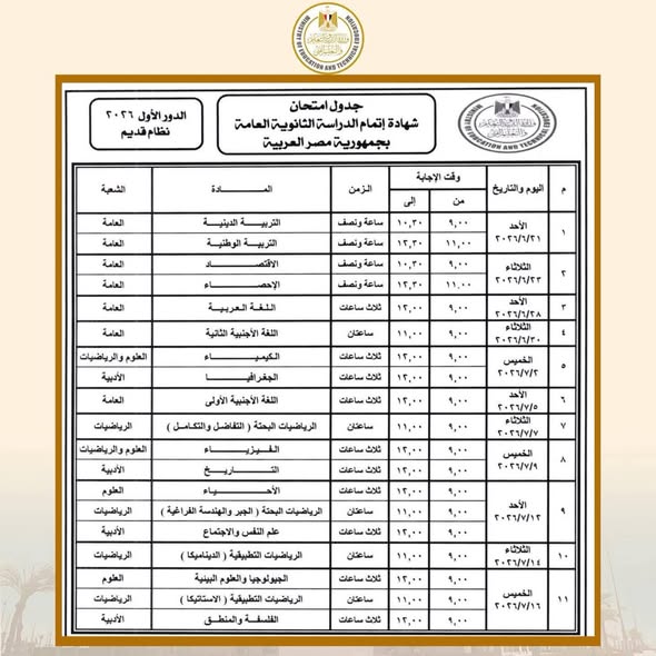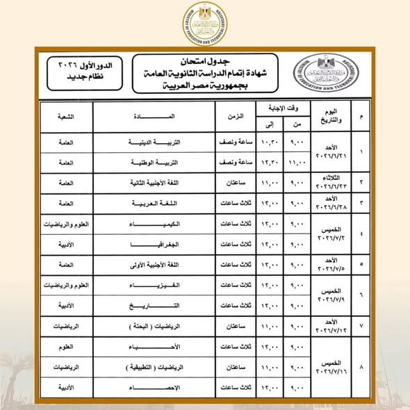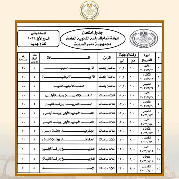 وزير التربية والتعليم يعتمد جدول امتحانات شهادة إتمام الثانوية العامة للدور الأول 2026